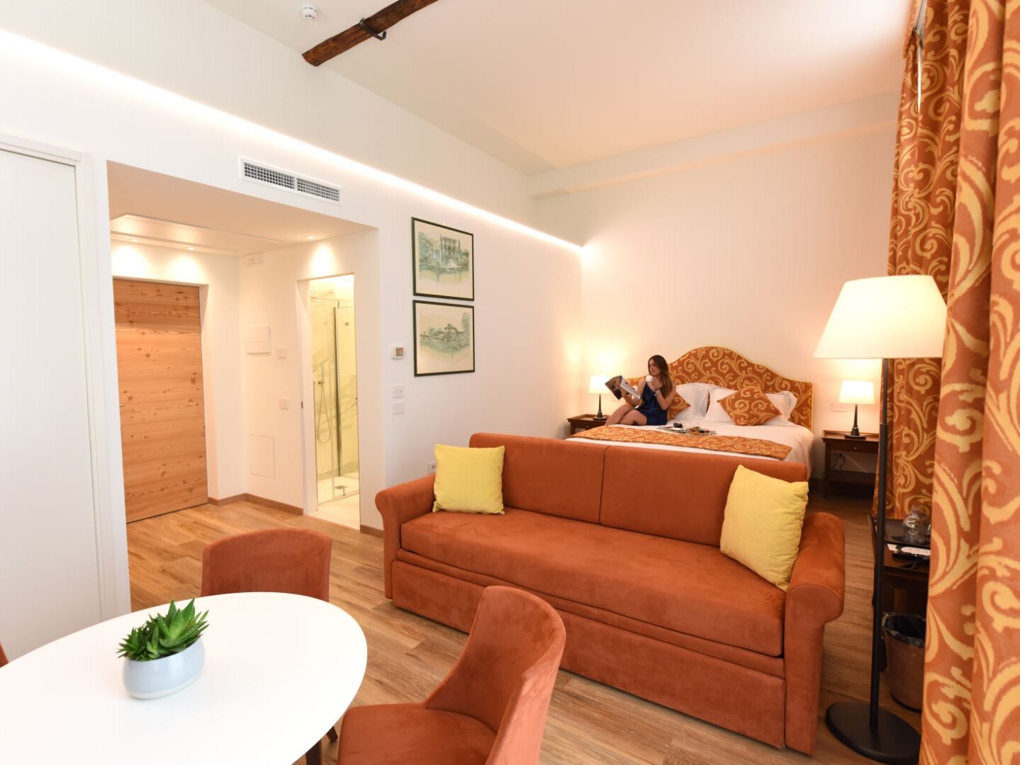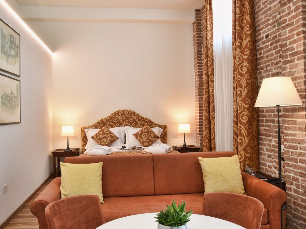Unsere Suiten sind mit Damasteinrichtung und freiliegendem Mauerwerk ausgestattet, die den zeitgenössischen Villenstil der Riviera del Brenta unterstreichen. Sie stellen die perfekte Wahl für einen entspannenden Aufenthalt in einer historischen Residenz dar. Das Schlafzimmer verfügt über ein Kingsize-Doppelbett und einen begehbaren Kleiderschrank, während der Wohnbereich mit einem Tisch für 4 Personen, einem Doppelschlafsofa und einer Küchenzeile ausgestattet ist. Ausgestattet mit einem konstanten Luftaustauschsystem, garantieren sie Ihr Wohlbefinden und einen frischen, hellen Luxus.