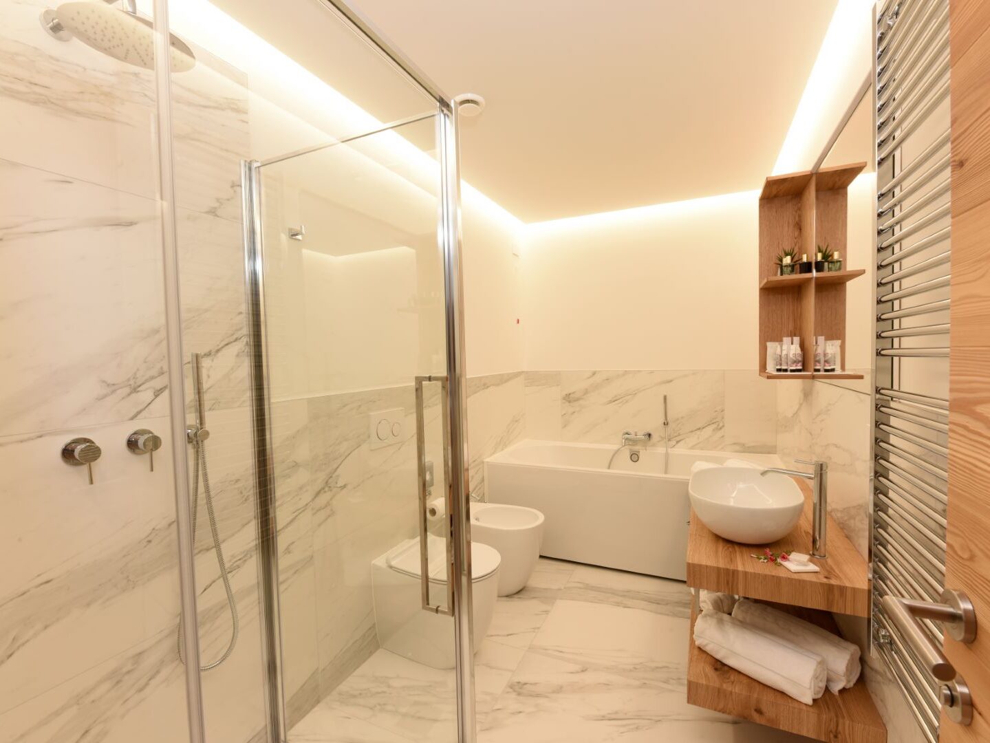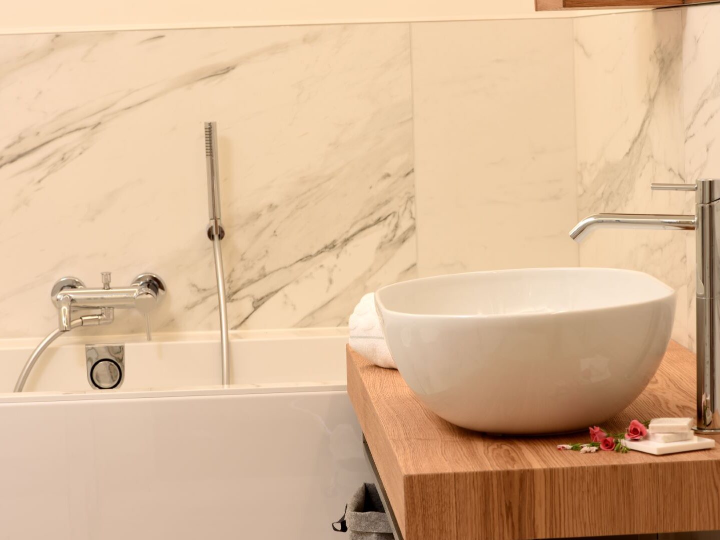 Geräumige, modern gestaltete Badezimmer mit separater Badewanne und Dusche runden das Wohlbefinden während Ihres Aufenthalts ab.